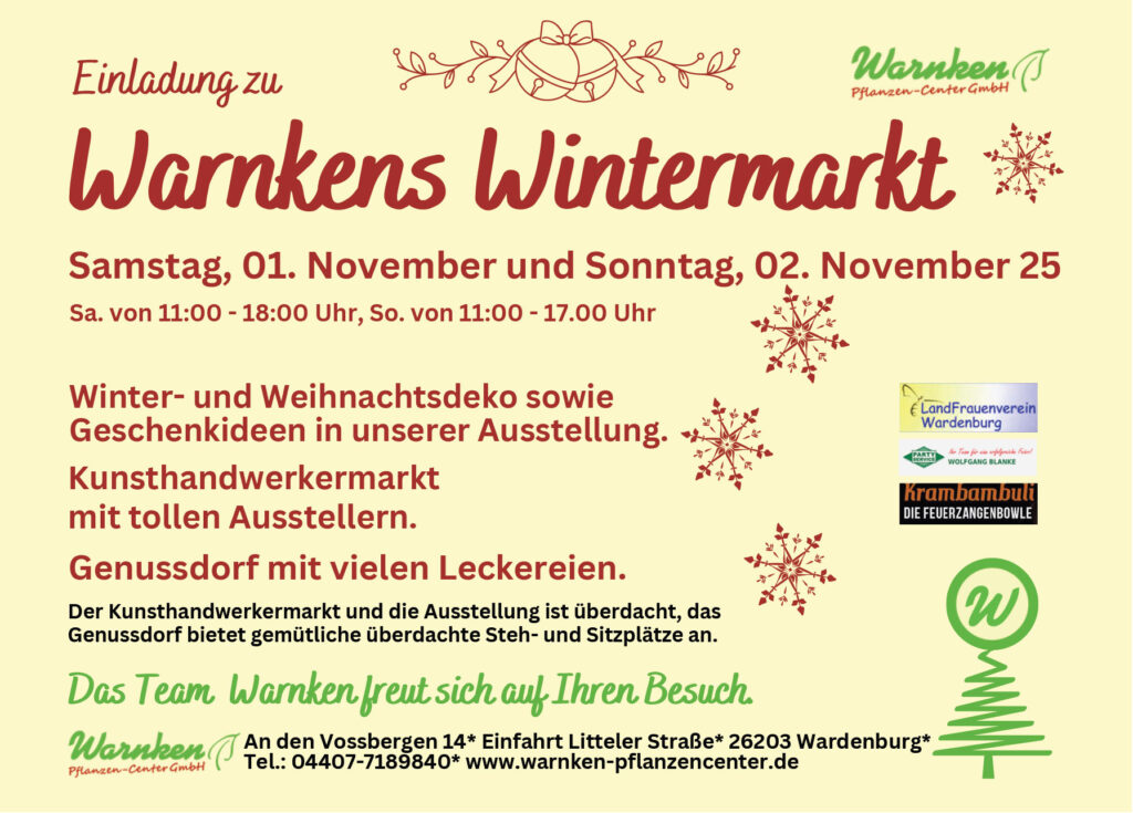 Herzliche Einladung zu Warnkens Wintermarkt am Sa, 01.11. + So., 02.11.2025. Samstag von 11:00 – 18:00 Uhr und Sonntag von 11:00 – 17:00 Uhr. Genieße bei knisterndem Lagerfeuer, Leckereien und Heißgetränken unsere weihnachtliche Ausstellung. Lass dich in unserer überdachten Ausstellung und auf dem Kunsthandwerkermarkt inspirieren und finde wunderbare Weihnachts- und Winterartikel für dein Zuhause. Unsere Genusswirte und die Landfrauen sorgen im Genussdorf für einige Leckereien und besondere Heiß- und Kaltgetränke. Das Genussdorf bietet überdachte Steh- und Sitzplätze an. Einfach die winterliche Atmosphäre genießen und die Seele baumeln lassen.