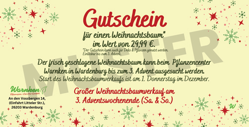 Bitte die Bestellung unter Angabe der Wunschanzahl an Weihnachtsbaumgutscheinen bis zum 30.11.2025 per Email, WhatsApp oder telefonisch an uns richten. AnschlieรŸend senden wir die Gutscheine mit der Rechnung per Post zu.